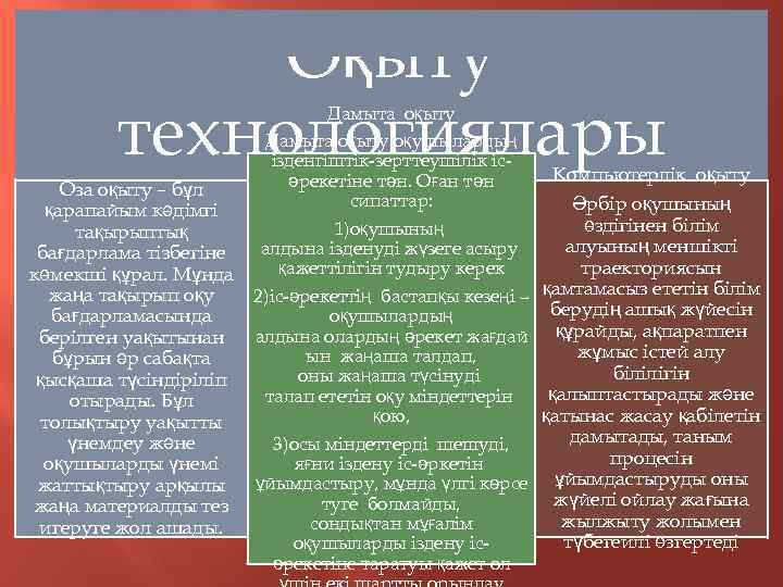 Оқыту технологиялары Оза оқыту – бұл қарапайым кәдімгі тақырыптық бағдарлама тізбегіне көмекші құрал. Мұнда жаңа тақырып оқу бағдарламасында берілген уақытынан бұрын әр сабақта қысқаша түсіндіріліп отырады. Бұл толықтыру уақытты үнемдеу және оқушыларды үнемі жаттықтыру арқылы жаңа материалды тез игеруге жол ашады. Дамыта оқыту оқушылардың ізденгіштік-зерттеушілік іс. Компьютерлік оқыту әрекетіне тән. Оған тән сипаттар: Әрбір оқушының өздігінен білім 1)оқушының алуының меншікті алдына ізденуді жүзеге асыру траекториясын қажеттілігін тудыру керек 2)іс-әрекеттің бастапқы кезеңі – қамтамасыз ететін білім берудің ашық жүйесін оқушылардың алдына олардың әрекет жағдай құрайды, ақпаратпен жұмыс істей алу ын жаңаша талдап, білілігін оны жаңаша түсінуді қалыптастырады және талап ететін оқу міндеттерін қатынас жасау қабілетін қою, дамытады, таным 3)осы міндеттерді шешуді, процесін яғни іздену іс-әркетін ұйымдастыру, мұнда үлгі көрсе ұйымдастыруды оны жүйелі ойлау жағына туге болмайды, жылжыту жолымен сондықтан мұғалім түбегейлі өзгертеді оқушыларды іздену ісәрекетіне таратуы қажет ол