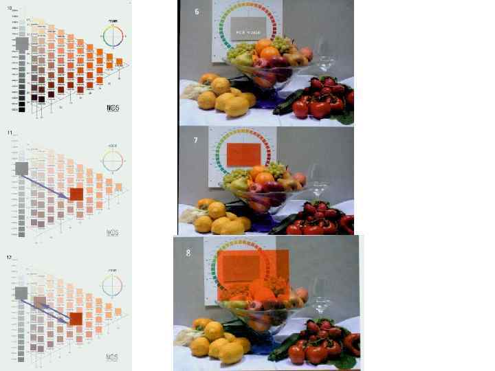 Когда на серый прямоугольник направляется свет сквозь красный светофильтр, то мы воспринимаем его цвет как красный (рис. 7), но как только мы видим (рис. 8), что красное световое пятно освещает и другие объекты в комнате, то мы можем увидеть (эффективно вычесть из общего относительного цветового изменения всех объектов), что это следствие освещения, а не свойство самого объекта. Сдвиги воспринимаемого цвета демонстрируются на карте постоянного цветового тона атласа системы NCS (Естественной цветовой системы).