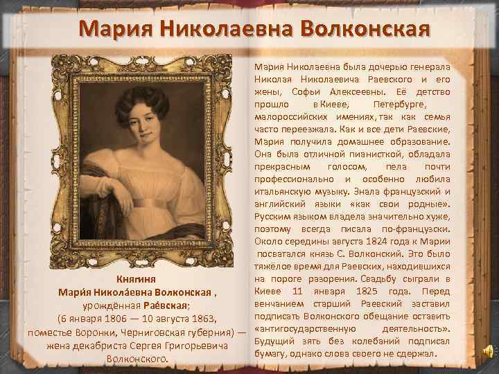 Мария Николаевна Волконская Мария Николаевна была дочерью генерала Николая Николаевича Раевского и его жены, Софьи Алексеевны. Её детство прошло в Киеве, Петербурге, малороссийских имениях, так как семья часто переезжала. Как и все дети Раевские, Мария получила домашнее образование. Она была отличной пианисткой, обладала прекрасным голосом, пела почти профессионально и особенно любила итальянскую музыку. Знала французский и английский языки «как свои родные» . Русским языком владела значительно хуже, поэтому всегда писала по-французски. Около середины августа 1824 года к Марии посватался князь С. Волконский. Это было тяжёлое время для Раевских, находившихся на пороге разорения. Свадьбу сыграли в Княгиня Киеве 11 января 1825 года. Перед Мари я Никола евна Волконская , венчанием старший Раевский заставил урождённая Рае вская; подписать Волконского обещание оставить (6 января 1806 — 10 августа 1863, деятельность» . поместье Воронки, Черниговская губерния) — «антигосударственную Будущий зять без колебаний подписал жена декабриста Сергея Григорьевича бумагу, однако слова своего не сдержал. Волконского.
