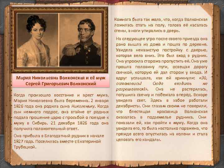 Комната была так мала, что, когда Волконская ложилась спать на полу, голова её касалась стены, а ноги упирались в дверь. Мария Николаевна Волконская и её муж Сергей Григорьевич Волконский Когда произошло восстание и арест мужа, Мария Николаевна была беременна. 2 января 1826 года она родила сына Николеньку. Когда сын немного подрос, она втайне от родных подала прошение царю с просьбой о поездке к мужу в Сибирь. 21 декабря 1826 года она получила положительный ответ. Она прибыла в Благодатный рудник в начале 1827 года. Поселилась вместе с Екатериной Трубецкой. На следующее утро после своего приезда она рано вышла из дома и пошла по деревне. Увидела неказистую постройку с дверью, которая вела вниз. Это был вход в рудник. Она упросила сторожа пропустить её. Она уже прошла половину пути, освещая дорогу свечкой, которую ей дал сторож у входа. И вдруг услышала, как ей крикнули: «Эй, остановись! Сюда входить не разрешается!» . Она не растерялась, потушила свечку и побежала вперёд. Вскоре увидела свет. Здесь в забое работали декабристы. Они глазам своим не поверили, что блестящая красавица Волконская оказалась в подземелье рудника. Они показали ей, как пройти к мужу. Когда она увидела его, то была настолько поражена, что прежде всего опустилась на колени и стала целовать его кандалы.