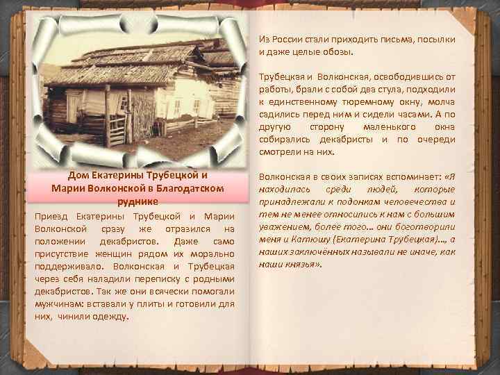 Из России стали приходить письма, посылки и даже целые обозы. Трубецкая и Волконская, освободившись от работы, брали с собой два стула, подходили к единственному тюремному окну, молча садились перед ним и сидели часами. А по другую сторону маленького окна собирались декабристы и по очереди смотрели на них. Дом Екатерины Трубецкой и Марии Волконской в Благодатском руднике Приезд Екатерины Трубецкой и Марии Волконской сразу же отразился на положении декабристов. Даже само присутствие женщин рядом их морально поддерживало. Волконская и Трубецкая через себя наладили переписку с родными декабристов. Так же они всячески помогали мужчинам: вставали у плиты и готовили для них, чинили одежду. Волконская в своих записях вспоминает: «Я находилась среди людей, которые принадлежали к подонкам человечества и тем не менее относились к нам с большим уважением, более того… они боготворили меня и Катюшу (Екатерина Трубецкая)…, а наших заключённых называли не иначе, как наши князья» .