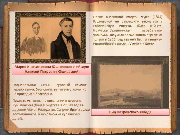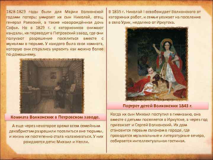 1828 -1829 годы были для Марии Волконской В 1835 г. Николай I освобождает Волконского от годами потерь: умирает их сын Николай, отец, каторжных работ, и семья уезжает на поселение генерал Раевский, а также новорождённая дочь в село Урик, недалеко от Иркутска. Софья. Но в 1829 г. с каторжников снимают кандалы, их переводят в Петровский завод, где они получают разрешение поселиться вместе с мужьями в тюрьме. У каждого была своя комната, которую они старались украсить как можно более по-домашнему. Портрет детей Волконских 1843 г. Комната Волконских в Петровском заводе. А еще через некоторое время всем семейным декабристам разрешили поселиться вне тюрьмы, и жизнь их постепенно стала налаживаться. У них рождаются дети: Михаил и Нелли. Когда их сын Михаил поступил в гимназию, она вместе с детьми поселяется в Иркутске, а через год приезжает и Сергей Волконский. Их дом становится первым салоном в городе, где проводятся музыкальные и литературные вечера, собирается интеллектуальная гостиная.