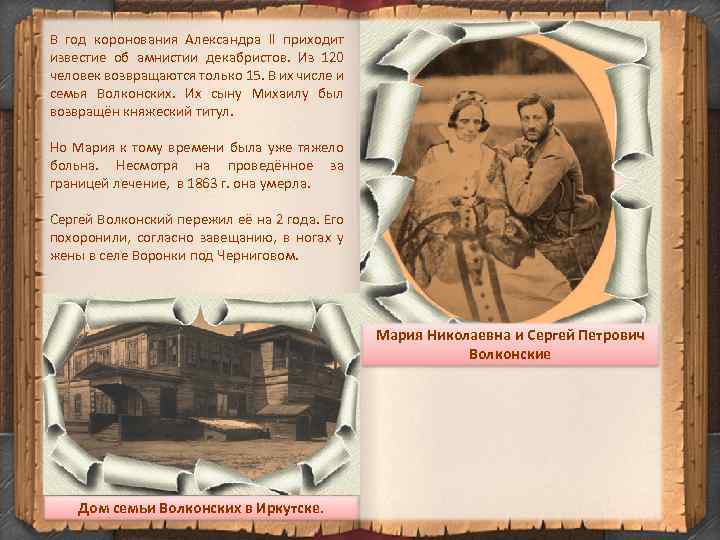 В год коронования Александра II приходит известие об амнистии декабристов. Из 120 человек возвращаются только 15. В их числе и семья Волконских. Их сыну Михаилу был возвращён княжеский титул. Но Мария к тому времени была уже тяжело больна. Несмотря на проведённое за границей лечение, в 1863 г. она умерла. Сергей Волконский пережил её на 2 года. Его похоронили, согласно завещанию, в ногах у жены в селе Воронки под Черниговом. Мария Николаевна и Сергей Петрович Волконские Дом семьи Волконских в Иркутске.