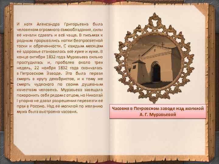 Александра Григорьевна Муравьёва Александра (Александрина) Григорьевна Муравьёва , урождённая графиня Чернышёва (1804 — 22 ноября 1832, Петровский Завод), сестра декабриста З. Г. Чернышёва, жена декабриста Н. М. Муравьёва, последовала за ним в Сибирь. Дочь действительного тайного советника графа Григория Ивановича Чернышёва и Елизаветы Петровны Квашниной. Самариной. Вместе с сёстрами Александра получила превосходное домашнее образование, учителем рисования у них был Маньяни. Чернышёвы смогли воспитать в своих детях душевное благородство и привить им нежную любовь друг к другу. 22 февраля 1823 года она стала женой Никиты Михайловича Муравьёва. Арест Мужа происходил в имении её родителей, на глазах у беременной жены, маленьких детей и больных тестя и тещи. Столько раз она умоляла Никиту не иметь никаких тайн от неё! Сколько раз он хотел открыться ей, но честь не позволяла ему подвести товарищей. А теперь, после декабрьского восстания, ему уже ничто не могло помочь, он - узник Петропавловской крепости, и все, что он может - это просить Александру молить за него Бога.
