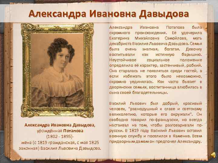 Александра Ивановна Давыдова Александра Ивановна Потапова была скромного происхождения. Её удочерила Екатерина Михайловна Самойлова, мать декабриста Василия Львовича Давыдова. Семья была очень знатная, богатая. Девочку воспитывали как истинную барышню. Неустойчивое социальное положение определило её характер, застенчивый, робкий. Она старалась не появляться среди гостей, а если избежать этого было невозможно, скромно уединялась. Как часто бывает в дворянских семьях, воспитанница влюбилась в сына своей благодетельницы. Александра Ивановна Давыдова, урождённая Потапова (1802 - 1895)- жена (с 1819 гражданская, с мая 1825 законная) Василия Львовича Давыдова. Василий Львович был добрый, красивый человек, "равнодушный к славе и светскому великолепию, которые его окружали". Он свободно говорил по-французски, но всегда настаивал на том, чтобы разговаривали порусски. В 1819 году Василий Львович оставил военную службу и поселился в Каменке. Всем придворным дамам он предпочел Александру.