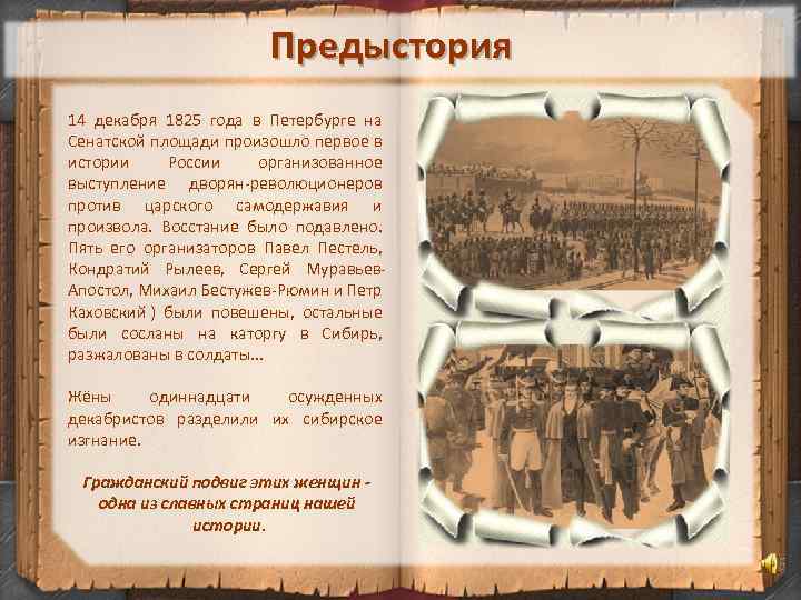 Предыстория 14 декабря 1825 года в Петербурге на Сенатской площади произошло первое в истории России организованное выступление дворян-революционеров против царского самодержавия и произвола. Восстание было подавлено. Пять его организаторов Павел Пестель, Кондратий Рылеев, Сергей Муравьев. Апостол, Михаил Бестужев-Рюмин и Петр Каховский ) были повешены, остальные были сосланы на каторгу в Сибирь, разжалованы в солдаты. . . Жёны одиннадцати осужденных декабристов разделили их сибирское изгнание. Гражданский подвиг этих женщин одна из славных страниц нашей истории.