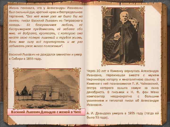 Жизнь показала, что у Александры Ивановны был сильный дух, кроткий нрав и беспредельное терпение. "Без неё меня уже не было бы на свете, - писал Василий Львович из Петровского завода. - Её безграничная любовь, её беспримерная преданность, её забота обо мне, её доброта, кротость, с которою она несёт свою полную лишений и трудов жизнь, дали мне силу всё перетерпеть и не раз забывать ужас моего положения". Василий Львович не дождался амнистии и умер в Сибири в 1855 году. Через 30 лет в Каменку вернулась Александра Ивановна, пережившая вместе с мужем Нерчинскую каторгу и многолетнюю ссылку. В Каменке с ней познакомился П. И. Чайковский, сестра которого вышла замуж за сына декабриста. В письмах к Н. Ф. фон Мекк композитор неоднократно с большим уважением и теплотой писал об Александре Ивановне. Василий Львович Давыдов с женой в Чите А. И. Давыдова умерла в 1895 году (тогда ей было 93 года).