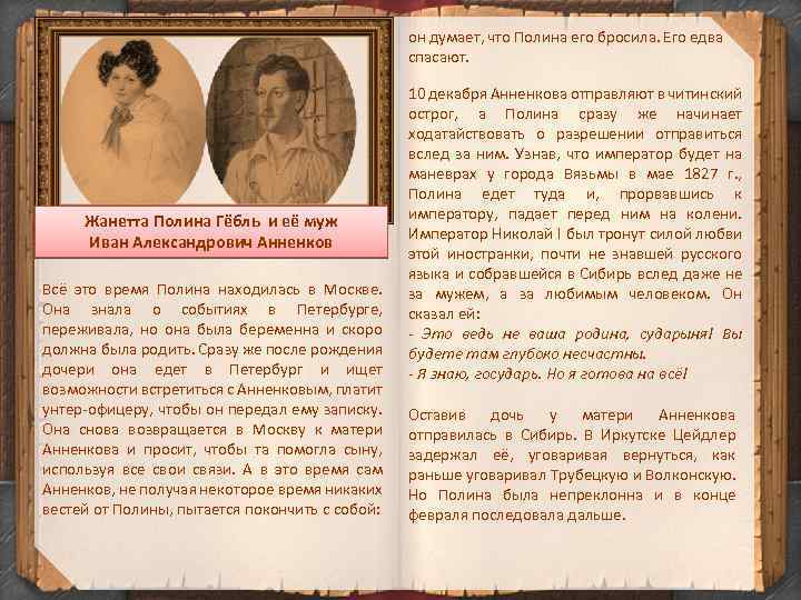 он думает, что Полина его бросила. Его едва спасают. Жанетта Полина Гёбль и её муж Иван Александрович Анненков Всё это время Полина находилась в Москве. Она знала о событиях в Петербурге, переживала, но она была беременна и скоро должна была родить. Сразу же после рождения дочери она едет в Петербург и ищет возможности встретиться с Анненковым, платит унтер-офицеру, чтобы он передал ему записку. Она снова возвращается в Москву к матери Анненкова и просит, чтобы та помогла сыну, используя все свои связи. А в это время сам Анненков, не получая некоторое время никаких вестей от Полины, пытается покончить с собой: 10 декабря Анненкова отправляют в читинский острог, а Полина сразу же начинает ходатайствовать о разрешении отправиться вслед за ним. Узнав, что император будет на маневрах у города Вязьмы в мае 1827 г. , Полина едет туда и, прорвавшись к императору, падает перед ним на колени. Император Николай I был тронут силой любви этой иностранки, почти не знавшей русского языка и собравшейся в Сибирь вслед даже не за мужем, а за любимым человеком. Он сказал ей: - Это ведь не ваша родина, сударыня! Вы будете там глубоко несчастны. - Я знаю, государь. Но я готова на всё! Оставив дочь у матери Анненкова отправилась в Сибирь. В Иркутске Цейдлер задержал её, уговаривая вернуться, как раньше уговаривал Трубецкую и Волконскую. Но Полина была непреклонна и в конце февраля последовала дальше.