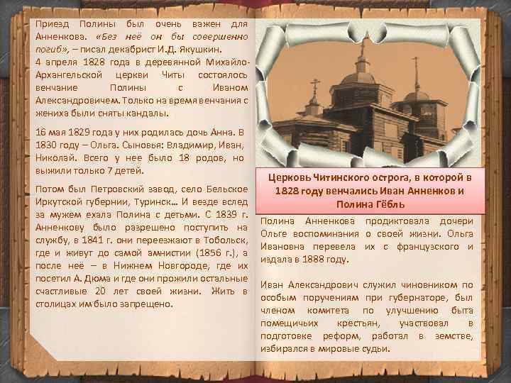 Приезд Полины был очень важен для Анненкова. «Без неё он бы совершенно погиб» , – писал декабрист И. Д. Якушкин. 4 апреля 1828 года в деревянной Михайло. Архангельской церкви Читы состоялось венчание Полины с Иваном Александровичем. Только на время венчания с жениха были сняты кандалы. 16 мая 1829 года у них родилась дочь Анна. В 1830 году – Ольга. Сыновья: Владимир, Иван, Николай. Всего у нее было 18 родов, но выжили только 7 детей. Потом был Петровский завод, село Бельское Иркутской губернии, Туринск… И везде вслед за мужем ехала Полина с детьми. С 1839 г. Анненкову было разрешено поступить на службу, в 1841 г. они переезжают в Тобольск, где и живут до самой амнистии (1856 г. ), а после неё – в Нижнем Новгороде, где их посетил А. Дюма и где они прожили остальные счастливые 20 лет своей жизни. Жить в столицах им было запрещено. Церковь Читинского острога, в которой в 1828 году венчались Иван Анненков и Полина Гёбль Полина Анненкова продиктовала дочери Ольге воспоминания о своей жизни. Ольга Ивановна перевела их с французского и издала в 1888 году. Иван Александрович служил чиновником по особым поручениям при губернаторе, был членом комитета по улучшению быта помещичьих крестьян, участвовал в подготовке реформ, работал в земстве, избирался в мировые судьи.