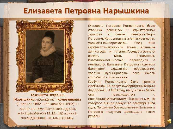 Елизавета Петровна Нарышкина , урождённая Коновницына (1 апреля 1802 — 11 декабря 1867) — фрейлина Императорского двора, жена декабриста М. М. Нарышкина, последовавшая за ним в ссылку. Елизавета Петровна Коновницына была старшим ребёнком и единственной дочерью в семье генерала Петровича Коновницына и Анны Ивановны, урождённой Корсаковой. Отец был героем Отечественной войны, военным министром и членом Государственного совета. Мать занималась благотворительностью, переводила с немецкого. Елизавета Петровна получила блестящее домашнее образование, хорошо музицировала, пела, имела способности к рисованию. Графиня Коновницына была принята фрейлиной ко двору императрицы Марии Фёдоровны. В 1823 году на одном из балов она познакомилась с полковником Михаилом Нарышкиным, за которого вышла замуж 12 сентября 1824 года. По случаю бракосочетания Елизавета Петровна получила двенадцать тысяч рублей.