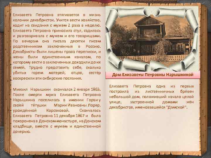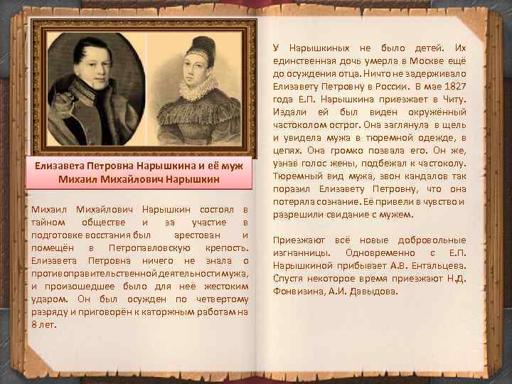 Елизавета Петровна Нарышкина и её муж Михаил Михайлович Нарышкин состоял в тайном обществе и за участие в подготовке восстания был арестован и помещён в Петропавловскую крепость. Елизавета Петровна ничего не знала о противоправительственной деятельности мужа, и произошедшее было для неё жестоким ударом. Он был осужден по четвертому разряду и приговорён к каторжным работам на 8 лет. У Нарышкиных не было детей. Их единственная дочь умерла в Москве ещё до осуждения отца. Ничто не задерживало Елизавету Петровну в России. В мае 1827 года Е. П. Нарышкина приезжает в Читу. Издали ей был виден окружённый частоколом острог. Она заглянула в щель и увидела мужа в тюремной одежде, в цепях. Она громко позвала его. Он же, узнав голос жены, подбежал к частоколу. Тюремный вид мужа, звон кандалов так поразил Елизавету Петровну, что она потеряла сознание. Её привели в чувство и разрешили свидание с мужем. Приезжают всё новые добровольные изгнанницы. Одновременно с Е. П. Нарышкиной прибывает А. В. Ентальцева. Спустя некоторое время приезжают Н. Д. Фонвизина, А. И. Давыдова.
