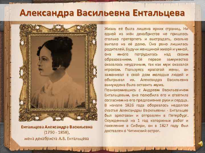 Александра Васильевна Ентальцева Александра Васильевна (1790 - 1858), жена декабриста А. В. Ентальцева Жизнь её была лишена ярких страниц. Ни одной из жён декабристов не пришлось столько претерпеть и выстрадать, сколько выпало на её долю. Она рано лишилась родителей. Будучи женщиной живой и умной, она много потрудилась над своим образованием. Её первое замужество оказалось неудачным, так как муж оказался игроком. Пользуясь красотой жены, он заманивал в свой дом молодых людей и обыгрывал их. Александра Васильевна вынуждена была оставить мужа. Познакомившись с Андреем Васильевичем Ентальцевым, она полюбила его и ответила согласием на его предложение руки и сердца. В начале 1826 года оборвалось недолгое счастье Александры Васильевны - Ентальцев был арестован и отправлен в Петербург. Осужденный на 1 год каторжных работ и поселение в Сибири, он в 1827 году был доставлен в Читинский острог.