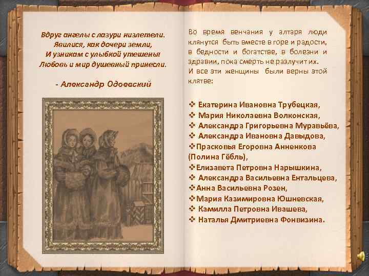 Вдруг ангелы с лазури низлетели. Явилися, как дочери земли, И узникам с улыбкой утешенья Любовь и мир душевный принесли. - Александр Одоевский Во время венчания у алтаря люди клянутся быть вместе в горе и радости, в бедности и богатстве, в болезни и здравии, пока смерть не разлучит их. И все эти женщины были верны этой клятве: v Екатерина Ивановна Трубецкая, v Мария Николаевна Волконская, v Александра Григорьевна Муравьёва, v Александра Ивановна Давыдова, v. Прасковья Егоровна Анненкова (Полина Гёбль), v. Елизавета Петровна Нарышкина, v Александра Васильевна Ентальцева, v. Анна Васильевна Розен, v. Мария Казимировна Юшневская, v Камилла Петровна Ивашева, v Наталья Дмитриевна Фонвизина.