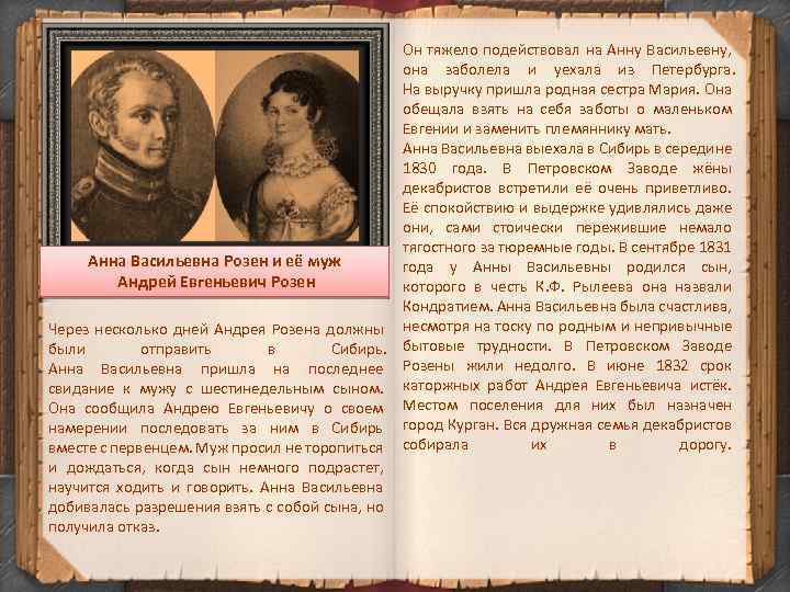 Анна Васильевна Розен и её муж Андрей Евгеньевич Розен Через несколько дней Андрея Розена должны были отправить в Сибирь. Анна Васильевна пришла на последнее свидание к мужу с шестинедельным сыном. Она сообщила Андрею Евгеньевичу о своем намерении последовать за ним в Сибирь вместе с первенцем. Муж просил не торопиться и дождаться, когда сын немного подрастет, научится ходить и говорить. Анна Васильевна добивалась разрешения взять с собой сына, но получила отказ. Он тяжело подействовал на Анну Васильевну, она заболела и уехала из Петербурга. На выручку пришла родная сестра Мария. Она обещала взять на себя заботы о маленьком Евгении и заменить племяннику мать. Анна Васильевна выехала в Сибирь в середине 1830 года. В Петровском Заводе жёны декабристов встретили её очень приветливо. Её спокойствию и выдержке удивлялись даже они, сами стоически пережившие немало тягостного за тюремные годы. В сентябре 1831 года у Анны Васильевны родился сын, которого в честь К. Ф. Рылеева она назвали Кондратием. Анна Васильевна была счастлива, несмотря на тоску по родным и непривычные бытовые трудности. В Петровском Заводе Розены жили недолго. В июне 1832 срок каторжных работ Андрея Евгеньевича истёк. Местом поселения для них был назначен город Курган. Вся дружная семья декабристов собирала их в дорогу.