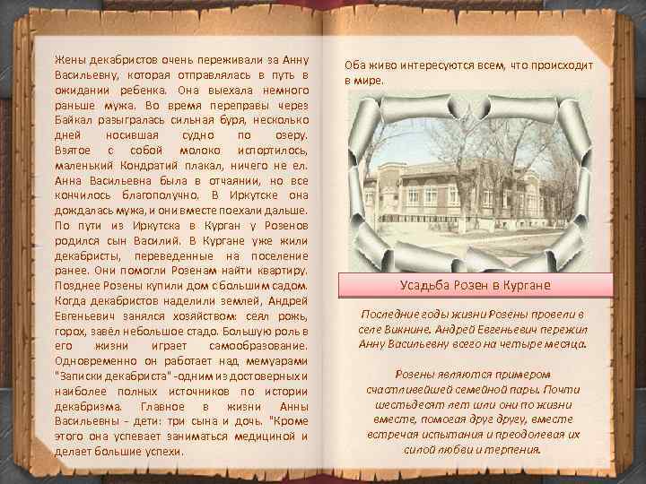 Жены декабристов очень переживали за Анну Васильевну, которая отправлялась в путь в ожидании ребенка. Она выехала немного раньше мужа. Во время переправы через Байкал разыгралась сильная буря, несколько дней носившая судно по озеру. Взятое с собой молоко испортилось, маленький Кондратий плакал, ничего не ел. Анна Васильевна была в отчаянии, но все кончилось благополучно. В Иркутске она дождалась мужа, и они вместе поехали дальше. По пути из Иркутска в Курган у Розенов родился сын Василий. В Кургане уже жили декабристы, переведенные на поселение ранее. Они помогли Розенам найти квартиру. Позднее Розены купили дом с большим садом. Когда декабристов наделили землей, Андрей Евгеньевич занялся хозяйством: сеял рожь, горох, завёл небольшое стадо. Большую роль в его жизни играет самообразование. Одновременно он работает над мемуарами "Записки декабриста" -одним из достоверных и наиболее полных источников по истории декабризма. Главное в жизни Анны Васильевны - дети: три сына и дочь. "Кроме этого она успевает заниматься медициной и делает большие успехи. Оба живо интересуются всем, что происходит в мире. Усадьба Розен в Кургане Последние годы жизни Розены провели в селе Викнине. Андрей Евгеньевич пережил Анну Васильевну всего на четыре месяца. Розены являются примером счастливейшей семейной пары. Почти шестьдесят лет шли они по жизни вместе, помогая другу, вместе встречая испытания и преодолевая их силой любви и терпения. 32