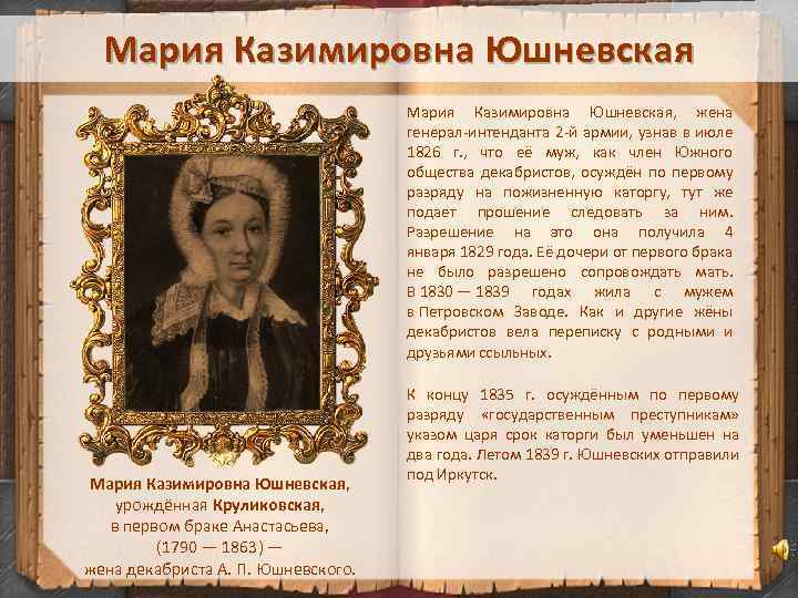 Мария Казимировна Юшневская, жена генерал-интенданта 2 -й армии, узнав в июле 1826 г. , что её муж, как член Южного общества декабристов, осуждён по первому разряду на пожизненную каторгу, тут же подает прошение следовать за ним. Разрешение на это она получила 4 января 1829 года. Её дочери от первого брака не было разрешено сопровождать мать. В 1830 — 1839 годах жила с мужем в Петровском Заводе. Как и другие жёны декабристов вела переписку с родными и друзьями ссыльных. Мария Казимировна Юшневская, урождённая Круликовская, в первом браке Анастасьева, (1790 — 1863) — жена декабриста А. П. Юшневского. К концу 1835 г. осуждённым по первому разряду «государственным преступникам» указом царя срок каторги был уменьшен на два года. Летом 1839 г. Юшневских отправили под Иркутск.