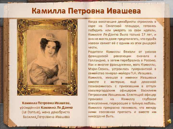 Камилла Петровна Ивашева, урожденная Камилла Ле Дантю (Le Dantue), жена декабриста Василия Петровича Ивашева Когда восставшие декабристы строились в каре на Сенатской площади, готовясь победить или умереть за свои идеалы, Камилле Ле-Дантю было только 17 лет, и она не могла даже предполагать, что судьба навеки свяжет её с одним из этих рыцарей чести. Родители Камиллы бежали от ужасов французской революции сначала в Голландию, а затем перебрались в Россию. Как и многие француженки, мать Камиллы, Мари-Сесиль, устроилась гувернанткой в семейство генерал-майора П. Н. Ивашева. Камилла, жившая в имении Ивашевых вместе с матерью, ещё девочкой познакомилась с приехавшим в отпуск кавалергардским офицером Василием Петровичем Ивашевым. Блестящий офицер произвел на Камиллу глубокое впечатление, переросшее в тайную любовь. Камилла прекрасно понимала, что между ними сословная пропасть и вместе им никогда не быть.