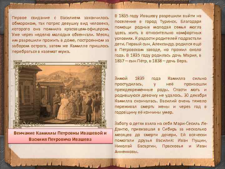 Первое свидание с Василием закончилось обмороком, так потряс девушку вид человека, которого она помнила красавцем-офицером. Уже через неделю молодых обвенчали. Месяц им разрешили прожить в доме, построенном за забором острога, затем же Камилле пришлось перебраться в каземат мужа. В 1835 году Ивашеву разрешили выйти на поселение в город Туринск. Благодаря помощи родных молодая семья могла здесь жить в относительно комфортных условиях. К радости родителей подрастали дети. Первый сын, Александр, родился ещё в Петровском заводе, но прожил около года. В 1835 году родилась дочь Мария, в 1837 – сын Пётр, в 1838 – дочь Вера. Зимой 1839 года Камилла сильно простудилась, у неё произошли преждевременные роды. Спасти мать и родившуюся девочку не удалось. 30 декабря Камилла скончалась. Василий очень тяжело переживал смерть жены и через год в годовщину её кончины умер. Венчание Камиллы Петровны Ивашевой и Василия Петровича Ивашева Заботу о детях взяла на себя Мари-Сесиль Ле. Дантю, приехавшая в Сибирь за несколько месяцев до смерти дочери. Ей всячески помогали друзья Василия: Иван Пущин, Николай Басаргин, Прасковья и Иван Анненковы.