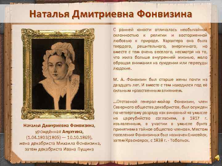 Наталья Дмитриевна Фонвизина С ранней юности отличалась необычайной склонностью к религии и восторженной любовью к природе. Характера она была твердого, решительного, энергичного, но вместе с тем очень веселого, несмотря на то, что жила больше внутренней жизнью, мало обращая внимания на суждения или пересуды людские. Наталья Дмитриевна Фонвизина, урождённая Апухтина, (1. 04. 1803(1805) — 10. 1869), жена декабриста Михаила Фонвизина, затем декабриста Ивана Пущина М. А. Фонвизин был старше жены почти на двадцать лет. И вместе с тем находился под её сильным нравственным влиянием. . . . Отставной генерал-майор Фонвизин, член Северного общества декабристов, был осужден по четвертому разряду как виновный «в умысле на цареубийство согласием, в 1817 г. изъявленным, в участии в умысле бунта принятием в тайное общество членов» . Местом поселения Фонвизиных был назначен Енисейск, затем Красноярск, с 1838 г. - Тобольск.