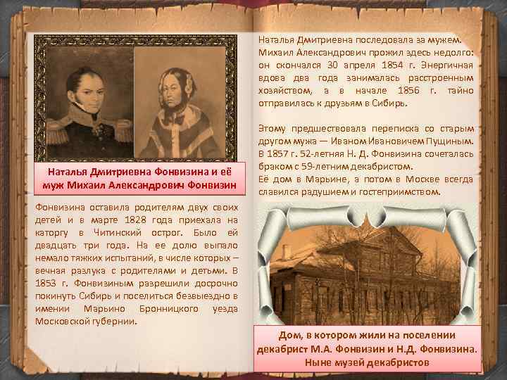 Наталья Дмитриевна последовала за мужем. Михаил Александрович прожил здесь недолго: он скончался 30 апреля 1854 г. Энергичная вдова два года занималась расстроенным хозяйством, а в начале 1856 г. тайно отправилась к друзьям в Сибирь. Наталья Дмитриевна Фонвизина и её муж Михаил Александрович Фонвизин Этому предшествовала переписка со старым другом мужа — Иваном Ивановичем Пущиным. В 1857 г. 52 -летняя Н. Д. Фонвизина сочеталась браком с 59 -летним декабристом. Её дом в Марьине, а потом в Москве всегда славился радушием и гостеприимством. Фонвизина оставила родителям двух своих детей и в марте 1828 года приехала на каторгу в Читинский острог. Было ей двадцать три года. На ее долю выпало немало тяжких испытаний, в числе которых – вечная разлука с родителями и детьми. В 1853 г. Фонвизиным разрешили досрочно покинуть Сибирь и поселиться безвыездно в имении Марьино Бронницкого уезда Московской губернии. Дом, в котором жили на поселении декабрист М. А. Фонвизин и Н. Д. Фонвизина. Ныне музей декабристов