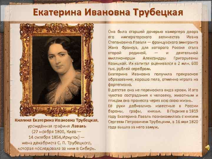 Екатерина Ивановна Трубецкая Княгиня Екатерина Ивановна Трубецкая, урождённая графиня Лаваль (27 ноября 1800, Киев — 14 октября 1854, Иркутск) — жена декабриста С. П. Трубецкого, которая последовала за ним в Сибирь. Она была старшей дочерью камергера двора его императорского величества Ивана Степановича Лаваля — французского эмигранта Жана Франсуа, для которого Россия стала второй родиной, — и деятельной миллионерши Александры Григорьевны Козицкой. Их капитал оценивался в 2 млн. 600 тыс. рублей серебром. Екатерина Ивановна получила прекрасное образование, хорошо пела, отменно играла на фортепиано. В детстве она не переносила вида крови. И это чувство сострадания к человеку, животным и птицам она пронесла через всю свою жизнь. Её руки добивались известные в России бароны, графы, князья. В Париже в 1819 году Екатерина Лаваль познакомилась с князем Сергеем Петровичем Трубецким, а 16 мая 1820 года вышла за него замуж. 4