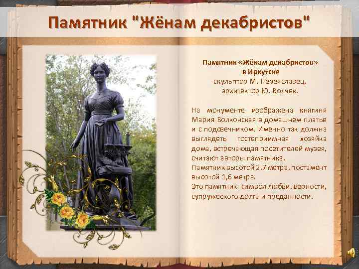 Памятник "Жёнам декабристов" Памятник «Жёнам декабристов» в Иркутске скульптор М. Переяславец, архитектор Ю. Волчек. На монументе изображена княгиня Мария Волконская в домашнем платье и с подсвечником. Именно так должна выглядеть гостеприимная хозяйка дома, встречающая посетителей музея, считают авторы памятника. Памятник высотой 2, 7 метра, постамент высотой 1, 6 метра. Это памятник- символ любви, верности, супружеского долга и преданности.