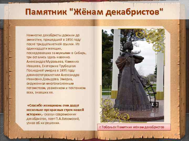 Памятник "Жёнам декабристов" Немногие декабристы дожили до амнистии, пришедшей в 1856 году после тридцатилетней ссылки. Из одиннадцати женщин, последовавших за мужьями в Сибирь, три остались здесь навечно. Александра Муравьева, Камилла Ивашева, Екатерина Трубецкая. Последней умерла в 1895 году девяностотрехлетняя Александра Ивановна Давыдова. Умерла, окруженная многочисленным потомством, уважением и почтением всех, знавших ее. «Спасибо женщинам: они дадут несколько прекрасных строк нашей истории» , - сказал современник декабристок, поэт П. А. Вяземский, узнав об их решении. г. Тобольск Памятник жёнам декабристов 41