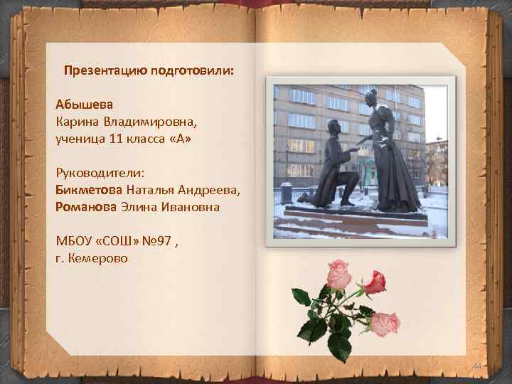 Презентацию подготовили: Абышева Карина Владимировна, ученица 11 класса «А» Руководители: Бикметова Наталья Андреева, Романова Элина Ивановна МБОУ «СОШ» № 97 , г. Кемерово 44