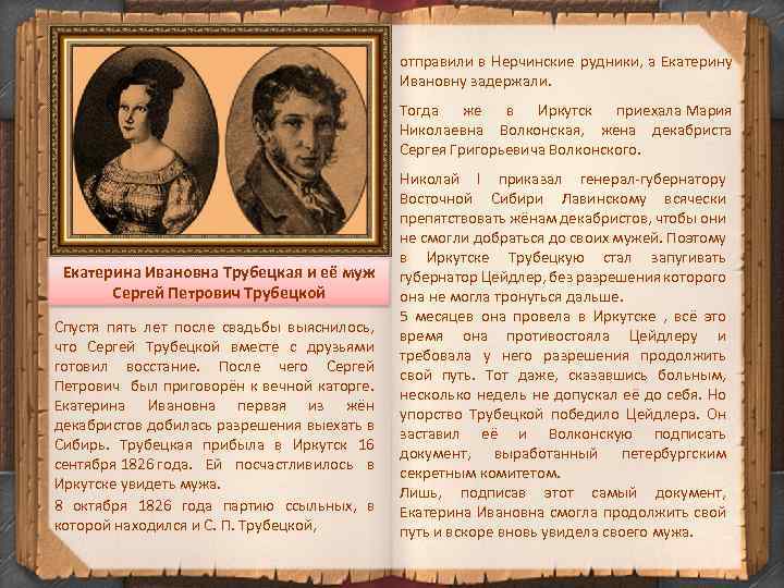 отправили в Нерчинские рудники, а Екатерину Ивановну задержали. Тогда же в Иркутск приехала Мария Николаевна Волконская, жена декабриста Сергея Григорьевича Волконского. Екатерина Ивановна Трубецкая и её муж Сергей Петрович Трубецкой Спустя пять лет после свадьбы выяснилось, что Сергей Трубецкой вместе с друзьями готовил восстание. После чего Сергей Петрович был приговорён к вечной каторге. Екатерина Ивановна первая из жён декабристов добилась разрешения выехать в Сибирь. Трубецкая прибыла в Иркутск 16 сентября 1826 года. Ей посчастливилось в Иркутске увидеть мужа. 8 октября 1826 года партию ссыльных, в которой находился и С. П. Трубецкой, Николай I приказал генерал-губернатору Восточной Сибири Лавинскому всячески препятствовать жёнам декабристов, чтобы они не смогли добраться до своих мужей. Поэтому в Иркутске Трубецкую стал запугивать губернатор Цейдлер, без разрешения которого она не могла тронуться дальше. 5 месяцев она провела в Иркутске , всё это время она противостояла Цейдлеру и требовала у него разрешения продолжить свой путь. Тот даже, сказавшись больным, несколько недель не допускал её до себя. Но упорство Трубецкой победило Цейдлера. Он заставил её и Волконскую подписать документ, выработанный петербургским секретным комитетом. Лишь, подписав этот самый документ, Екатерина Ивановна смогла продолжить свой путь и вскоре вновь увидела своего мужа.