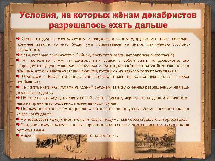 Условия, на которых жёнам декабристов разрешалось ехать дальше Жена, следуя за своим мужем и продолжая с ним супружескую связь, потеряет прежнее звание, то есть будет уже признаваема не иначе, как женою ссыльнокаторжного; Дети, которые приживутся в Сибири, поступят в коренные заводские крестьяне; Ни денежных сумм, ни драгоценных вещей с собой взять не дозволено; это запрещается существующими правилами и нужно для собственной их безопасности по причине, что сии места населены людьми, готовыми на всякого рода преступления; Отъездом в Нерченский край уничтожается право на крепостных людей, с ними прибывших; Не искать никакими путями свиданий с мужем, за исключением разрешённых, не чаще двух раз в неделю; Не передавать мужу никаких вещей, денег, бумаги, чернил, карандашей и ничего от него не принимать, особенно писем, записок, бумаг; Никому не писать и не отправлять. Ни от кого не получать писем, иначе как только через коменданта; Не передавать мужу спиртных напитков, а пищу – лишь через старшего унтер-офицера; Свидания с мужем иметь лишь в арестантской палате и разговаривать с ним лишь на русском языке; Никуда не отлучаться от места своего пребывания. 6