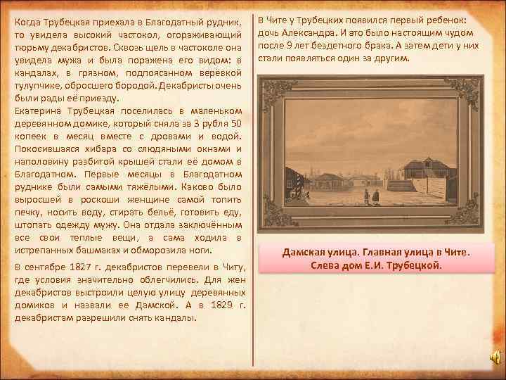 Когда Трубецкая приехала в Благодатный рудник, то увидела высокий частокол, огораживающий тюрьму декабристов. Сквозь щель в частоколе она увидела мужа и была поражена его видом: в кандалах, в грязном, подпоясанном верёвкой тулупчике, обросшего бородой. Декабристы очень были рады её приезду. Екатерина Трубецкая поселилась в маленьком деревянном домике, который сняла за 3 рубля 50 копеек в месяц вместе с дровами и водой. Покосившаяся хибара со слюдяными окнами и наполовину разбитой крышей стали её домом в Благодатном. Первые месяцы в Благодатном руднике были самыми тяжёлыми. Каково было выросшей в роскоши женщине самой топить печку, носить воду, стирать бельё, готовить еду, штопать одежду мужу. Она отдала заключённым все свои теплые вещи, а сама ходила в истрепанных башмаках и обморозила ноги. В сентябре 1827 г. декабристов перевели в Читу, где условия значительно облегчились. Для жен декабристов выстроили целую улицу деревянных домиков и назвали ее Дамской. А в 1829 г. декабристам разрешили снять кандалы. В Чите у Трубецких появился первый ребенок: дочь Александра. И это было настоящим чудом после 9 лет бездетного брака. А затем дети у них стали появляться один за другим. Дамская улица. Главная улица в Чите. Слева дом Е. И. Трубецкой.