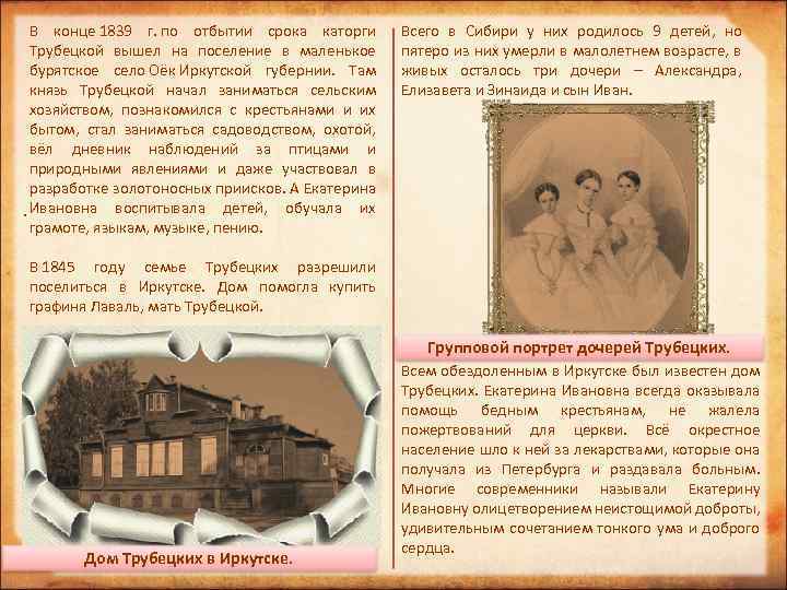 В конце 1839 г. по отбытии срока каторги Трубецкой вышел на поселение в маленькое бурятское село Оёк Иркутской губернии. Там князь Трубецкой начал заниматься сельским хозяйством, познакомился с крестьянами и их бытом, стал заниматься садоводством, охотой, вёл дневник наблюдений за птицами и природными явлениями и даже участвовал в разработке золотоносных приисков. А Екатерина . Ивановна воспитывала детей, обучала их грамоте, языкам, музыке, пению. Всего в Сибири у них родилось 9 детей, но пятеро из них умерли в малолетнем возрасте, в живых осталось три дочери – Александра, Елизавета и Зинаида и сын Иван. В 1845 году семье Трубецких разрешили поселиться в Иркутске. Дом помогла купить графиня Лаваль, мать Трубецкой. Групповой портрет дочерей Трубецких. Дом Трубецких в Иркутске. Всем обездоленным в Иркутске был известен дом Трубецких. Екатерина Ивановна всегда оказывала помощь бедным крестьянам, не жалела пожертвований для церкви. Всё окрестное население шло к ней за лекарствами, которые она получала из Петербурга и раздавала больным. Многие современники называли Екатерину Ивановну олицетворением неистощимой доброты, удивительным сочетанием тонкого ума и доброго сердца.