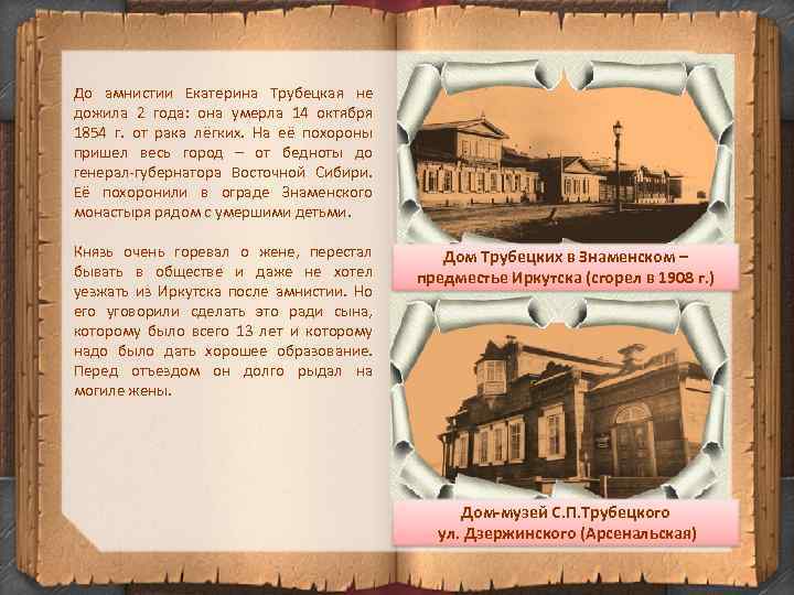 До амнистии Екатерина Трубецкая не дожила 2 года: она умерла 14 октября 1854 г. от рака лёгких. На её похороны пришел весь город – от бедноты до генерал-губернатора Восточной Сибири. Её похоронили в ограде Знаменского монастыря рядом с умершими детьми. Князь очень горевал о жене, перестал бывать в обществе и даже не хотел уезжать из Иркутска после амнистии. Но его уговорили сделать это ради сына, которому было всего 13 лет и которому надо было дать хорошее образование. Перед отъездом он долго рыдал на могиле жены. Дом Трубецких в Знаменском – предместье Иркутска (сгорел в 1908 г. ) Дом-музей С. П. Трубецкого ул. Дзержинского (Арсенальская)