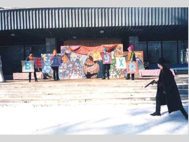 Это программа в виде мюзикла-шутки, посвященная проводам русской зимы. В отличие от распространенной традиции здесь предпринята попытка решить праздник не в виде традиционной Масленицы, а соединить традиции русского фольклора с вполне современными реалиями. Программа разработана сотрудниками кафедры СКСТ и исполнена актерами трех ивановских театров по заказам международного туристского центра «Малинки» и санатория «Оболсуново» . Действующие лица мюзикла: Ведущая в образе традиционной сказительницы, Мужичок-Лешачок, его супружница, она же Ведьмуха, которую Лешачок сгоряча «замочил» в бочке с помядорчиками, молодка Кикиморка, Ведьма-прктиканточка, Снежная королева, Сыщик, свидетели Дед да Бабка, девица на выданье Ягодка-Малинка, ее лучший дружок Мишутка, Крутой царевич-залетка, зеленый змий Дракоша, Весна-красна, скоморохи-зазывалы. Выход каждого персонажа предварялся пластической заставкой в исполнении танцевальной группы, которая заканчивалась появлением имени персонажа, составленного из разноцветных букв на квадратах из ситцевых тканей. В мюзикле использовалась причудливая смесь народных мелодий, популярной классики и шлягеров современной эстрады. В действие активно включалась публика.