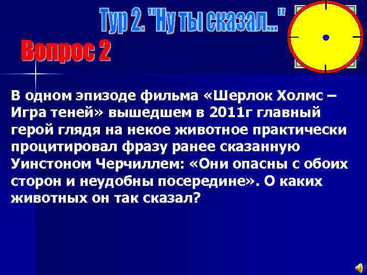 В одном эпизоде фильма «Шерлок Холмс – Игра теней» вышедшем в 2011 г главный герой глядя на некое животное практически процитировал фразу ранее сказанную Уинстоном Черчиллем: «Они опасны с обоих сторон и неудобны посередине» . О каких животных он так сказал?