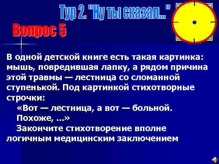 В одной детской книге есть такая картинка: мышь, повредившая лапку, а рядом причина этой травмы — лестница со сломанной ступенькой. Под картинкой стихотворные строчки: «Вот — лестница, а вот — больной. Похоже, . . . » Закончите стихотворение вполне логичным медицинским заключением