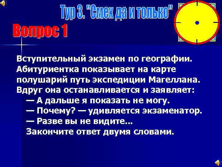 Вступительный экзамен по географии. Абитуриентка показывает на карте полушарий путь экспедиции Магеллана. Вдруг она останавливается и заявляет: — А дальше я показать не могу. — Почему? — удивляется экзаменатор. — Разве вы не видите. . . Закончите ответ двумя словами.