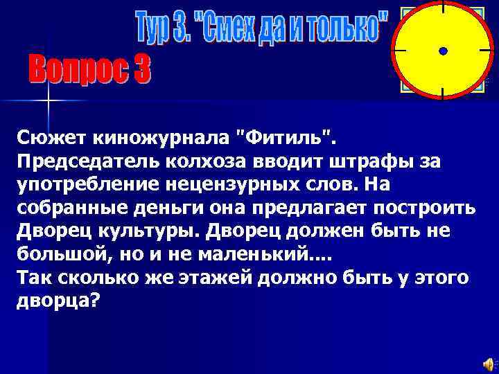 Сюжет киножурнала "Фитиль". Председатель колхоза вводит штрафы за употребление нецензурных слов. На собранные деньги она предлагает построить Дворец культуры. Дворец должен быть не большой, но и не маленький. . Так сколько же этажей должно быть у этого дворца?