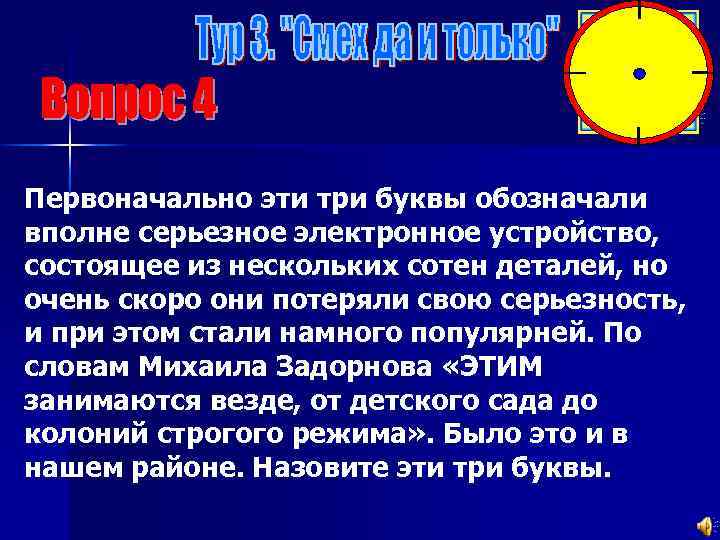 Первоначально эти три буквы обозначали вполне серьезное электронное устройство, состоящее из нескольких сотен деталей, но очень скоро они потеряли свою серьезность, и при этом стали намного популярней. По словам Михаила Задорнова «ЭТИМ занимаются везде, от детского сада до колоний строгого режима» . Было это и в нашем районе. Назовите эти три буквы.