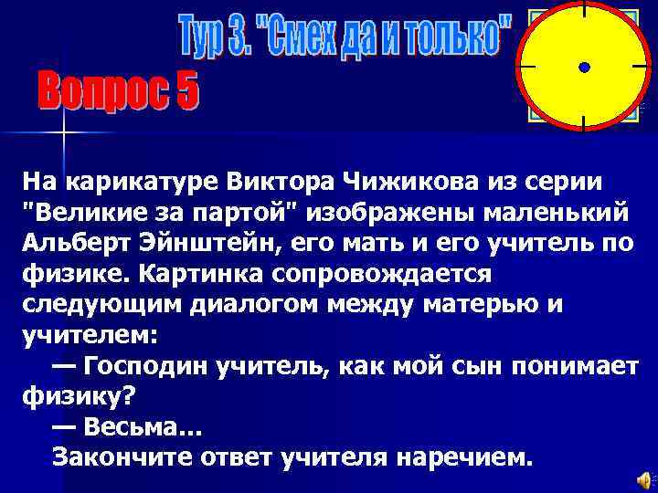 На карикатуре Виктора Чижикова из серии "Великие за партой" изображены маленький Альберт Эйнштейн, его мать и его учитель по физике. Картинка сопровождается следующим диалогом между матерью и учителем: — Господин учитель, как мой сын понимает физику? — Весьма. . . Закончите ответ учителя наречием.