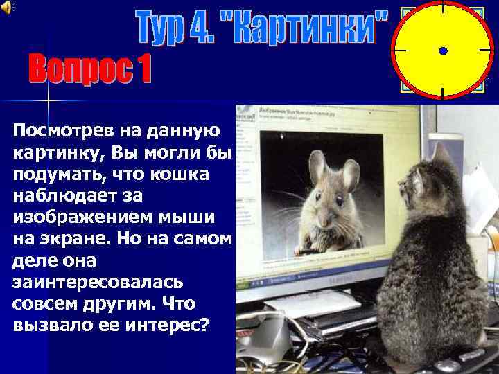Посмотрев на данную картинку, Вы могли бы подумать, что кошка наблюдает за изображением мыши на экране. Но на самом деле она заинтересовалась совсем другим. Что вызвало ее интерес?