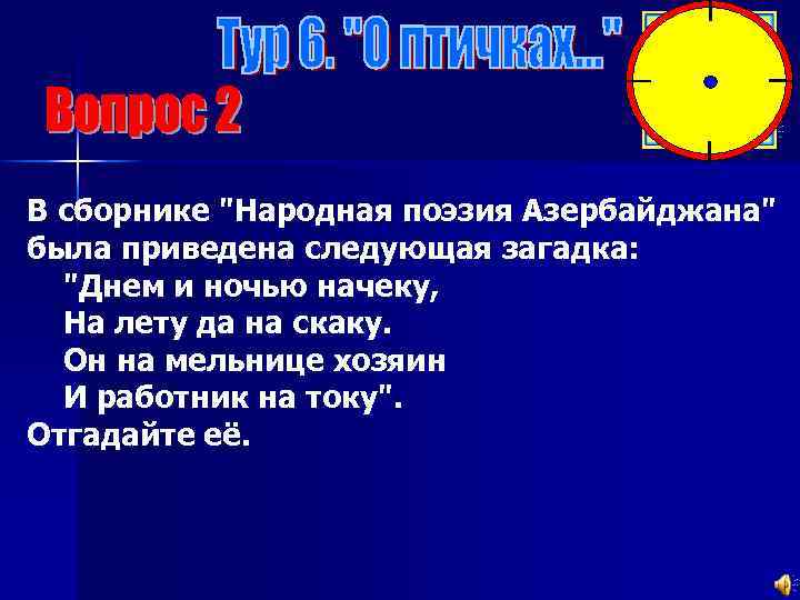 В сборнике "Народная поэзия Азербайджана" была приведена следующая загадка: "Днем и ночью начеку, На лету да на скаку. Он на мельнице хозяин И работник на току". Отгадайте её.