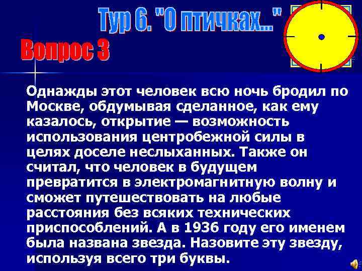 Однажды этот человек всю ночь бродил по Москве, обдумывая сделанное, как ему казалось, открытие — возможность использования центробежной силы в целях доселе неслыханных. Также он считал, что человек в будущем превратится в электромагнитную волну и сможет путешествовать на любые расстояния без всяких технических приспособлений. А в 1936 году его именем была названа звезда. Назовите эту звезду, используя всего три буквы.