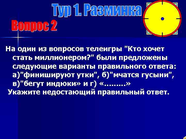 На один из вопросов телеигры "Кто хочет стать миллионером? " были предложены следующие варианты правильного ответа: а)"финишируют утки", б)"мчатся гусыни", в)"бегут индюки» и г) «………» Укажите недостающий правильный ответ.