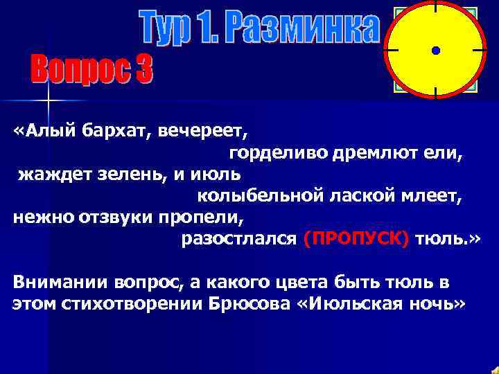 «Алый бархат, вечереет, горделиво дремлют ели, жаждет зелень, и июль колыбельной лаской млеет, нежно отзвуки пропели, разостлался (ПРОПУСК) тюль. » Внимании вопрос, а какого цвета быть тюль в этом стихотворении Брюсова «Июльская ночь»