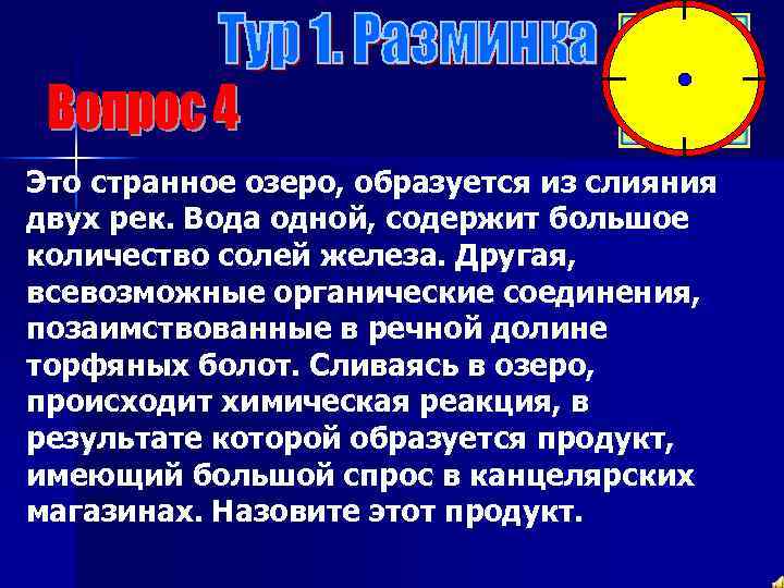 Это странное озеро, образуется из слияния двух рек. Вода одной, содержит большое количество солей железа. Другая, всевозможные органические соединения, позаимствованные в речной долине торфяных болот. Сливаясь в озеро, происходит химическая реакция, в результате которой образуется продукт, имеющий большой спрос в канцелярских магазинах. Назовите этот продукт.
