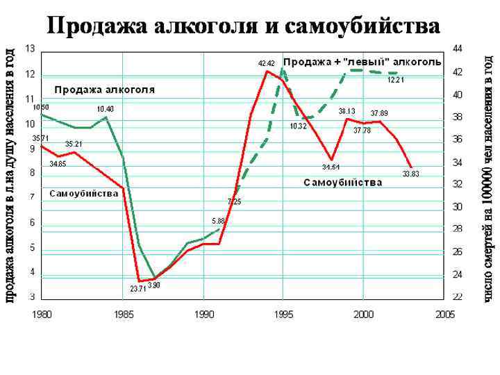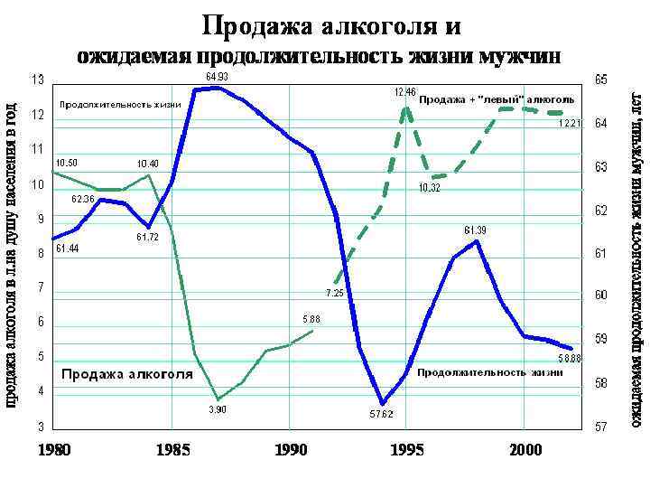Зависимость смертности от количества употребления алкоголя в России 1 – начало антиалкогольной кампании; 2 – начало рыночных реформ; а – линия регрессии для 1965 — 1984; б – для 1986 — 1991. Общее количество смертей в России в 1965 — 2000 гг. Заметное снижение смертности началось уже через 2 -3 месяца после начала кампании, а очевидное — через полтора года: на 203, 5 тысячи или на 12, 3 % (1986 г. ) от общего числа смертей в 1984 г. За это время среднедушевое потребление алкоголя снизилось на 3, 7 литра, при том, что зависимость смертности от потребления была строго линейной в 1984 — 1986 гг.