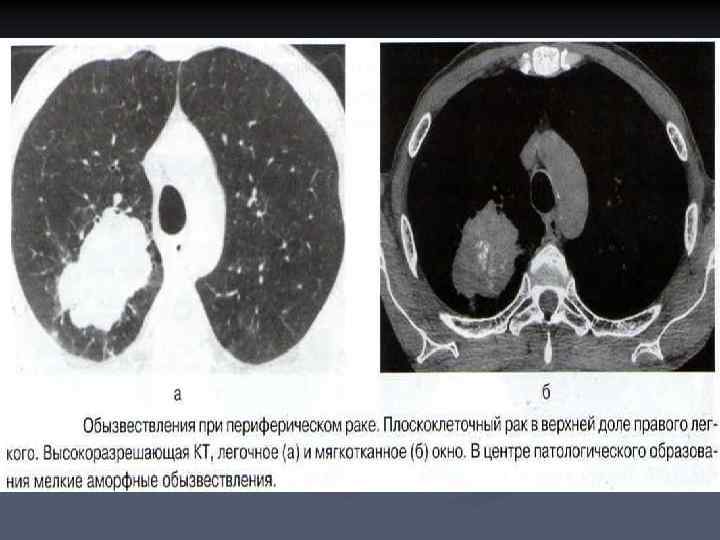 n n n Обызвествления в опухолевом узле чаще возникают при железистом раке, имеют аморфный или мелкоточечный характер и располагаются эксцентрично. Исключительно редко при периферическом раке выявляются «доброкачественные» обызвествления в виде крупных центрально расположенных очагов. Плотностные показатели которых при нативном исследовании превышают 200 HU, такие образования чаще возникают вокруг посттуберкулезного обызвествления.