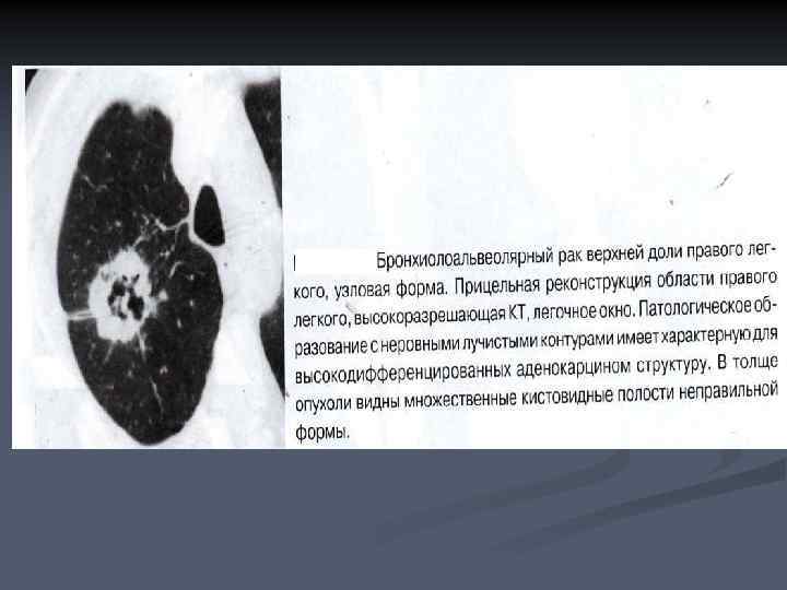 n n Узловая форма отображается в виде патологического образования округлой формы, которое обычно не отличается от периферической аденокарциномы. Характерными признаками являются длинные толстые тяжи, направленные от опухоли в сторону корня легкого и плевры, и своеобразная ячеистая структура образования, что обусловлено формированием в строме опухоли многочисленных мелких кистозных полостей. Имеет мягкотканую плотность, окружена зоной уплотнения по типу матового стекла. Типичным признаком узловой формы БАР является видимость просвета мелких бронхов в опухоли.