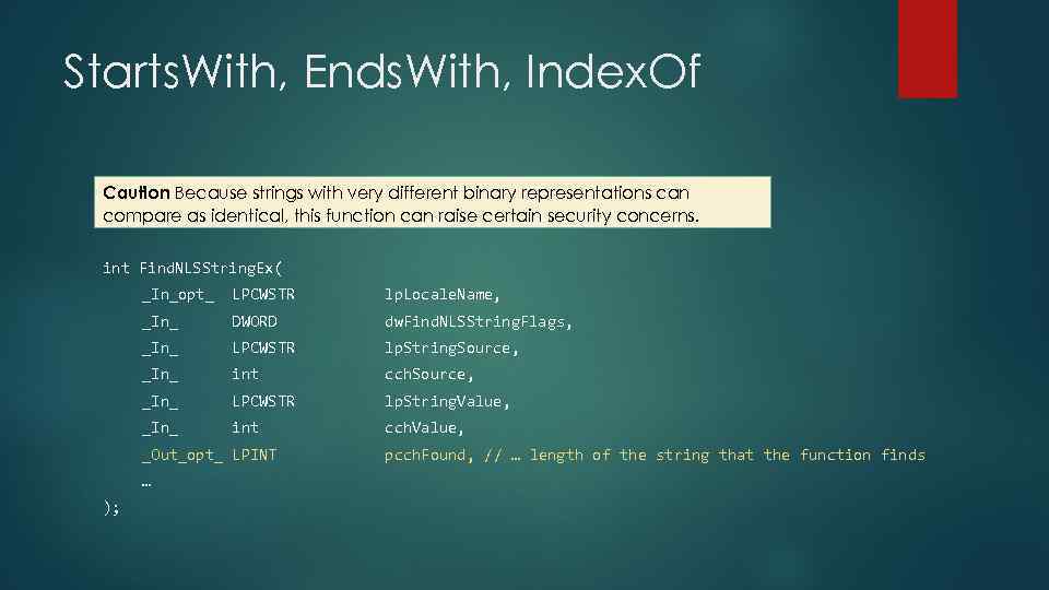 Starts. With, Ends. With, Index. Of Caution Because strings with very different binary representations can compare as identical, this function can raise certain security concerns. int Find. NLSString. Ex( _In_opt_ LPCWSTR lp. Locale. Name, _In_ DWORD dw. Find. NLSString. Flags, _In_ LPCWSTR lp. String. Source, _In_ int cch. Source, _In_ LPCWSTR lp. String. Value, _In_ int cch. Value, _Out_opt_ LPINT pcch. Found, // … length of the string that the function finds … );